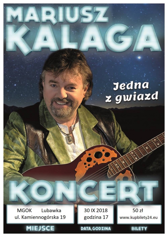 Z przyjemnością informujemy, że 30 września 2018 r. (niedziela) na saliwidowiskowej Domu Kultury w Lubawce wystąpi Mariusz Kalaga - muzyk, piosenkarz, wykonawca estradowy, urodzony i zamieszkały w Dąbrowie Górniczej, znany z "Listy Śląskich Szlagierów". Organizatorem koncertu jest grupa Impresariat Wena.