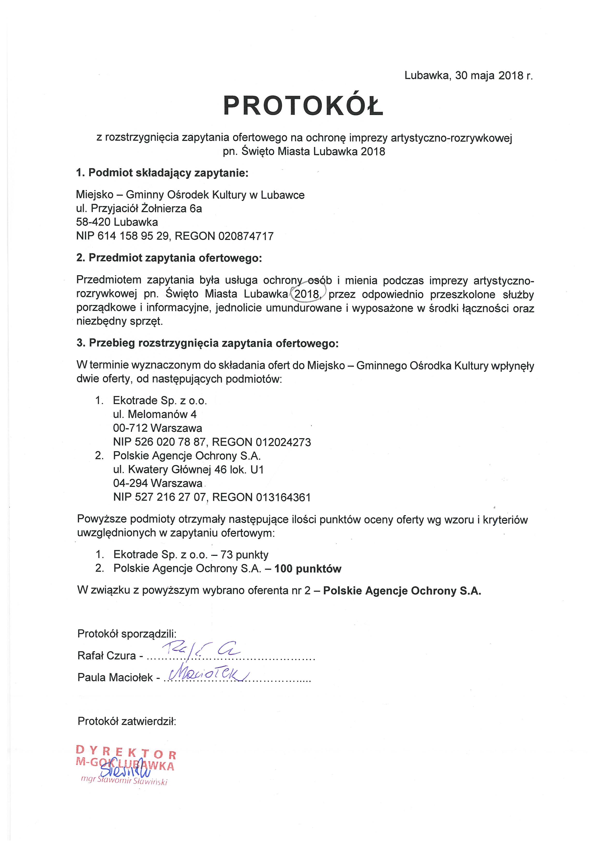 Rozstrzygnięcie zapytania ofertowego na ochronę Święta Miasta 2018 Protokół w załączniku. Pliki do pobrania Protokół rozstrzygnięcia zapytania ofertowego Rafał Czura MGOK Data wydarzenia: 2018-06-19 Stworzony: 2018-06-19 09:24 Edytowany: 2018-11-07 14:10