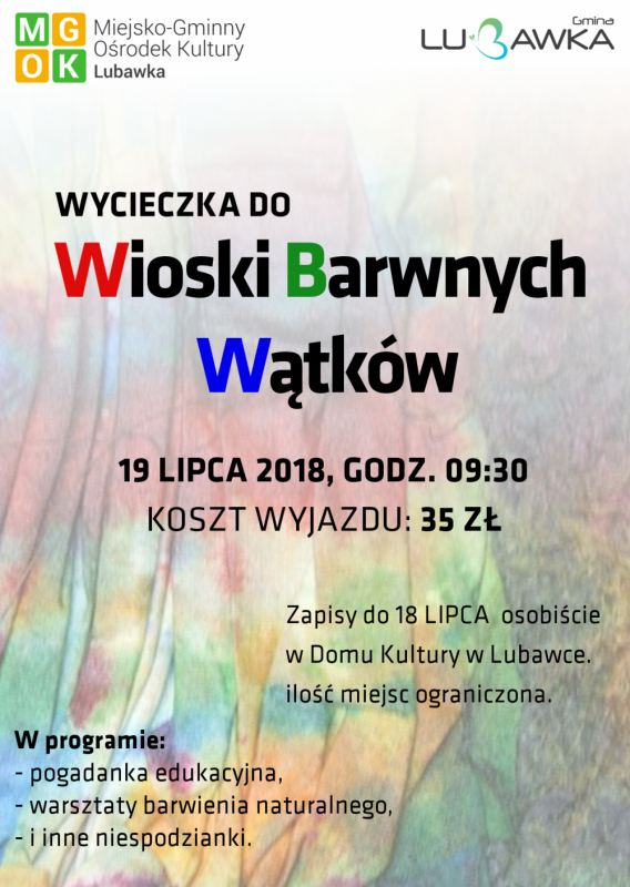 Zapraszamy na niesamowitą wycieczkę do Chrośnica wioska barwnych wątków. W programie wiele atrakcji, ilość miejsc ograniczona! Zapisy bezpośrednio w Domu Kultury w Lubawce lub pod numerem tel. 75 74 11 362, wew. 20.