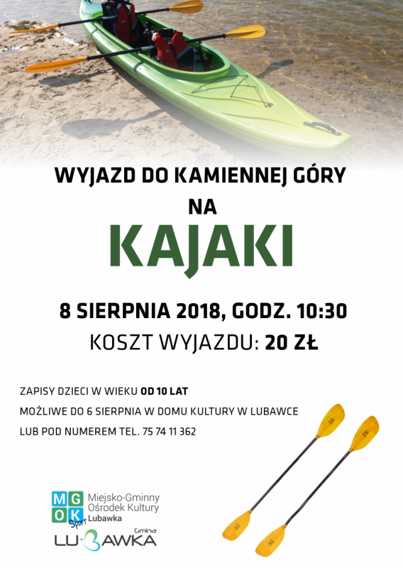 Dom Kultury w Lubawce zaprasza dzieci w wieku szkolnym (od 10 lat) na wyjazd do Kamiennej Góry na kajaki i rowery wodne. Wyjazd zaplanowano na 8 sierpnia br. o godz. 10:30, koszt wycieczki wynosi 20 zł. Zapisy do 6 sierpnia, ilość miejsc ograniczona. Serdecznie zapraszamy!