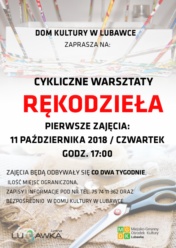 Miło nam poinformować, że od jutra rusza kolejny cykl zajęć cyklicznych. Zapraszamy dzieci i młodzież na warsztaty RĘKODZIEŁA, które będą się odbywać co dwa tygodnie w Domu Kultury w Lubawce. Zaczynamy jutro o godz. 17:00. Do zobaczenia