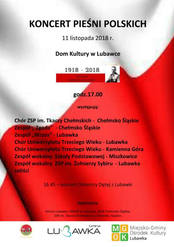 Miejsko-Gminny Ośrodek Kultury, Gmina Lubawka oraz Zespół Szkól Publicznych im. Tkaczy Chełmskich zaprasza 11 listopada br. o godz. 17:00 na Koncert Pieśni Polskich organizowany w ramach obchodów Narodowego Święta Niepodległości.
