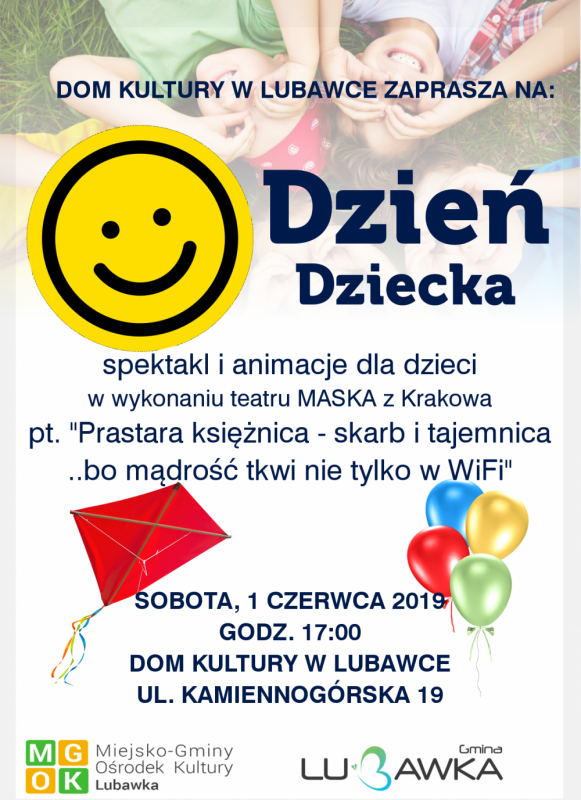 DZIEŃ DZIECKA Zapraszamy małe i duże dzieci już w najbliższą sobotę (01.06.2019) do Domu Kultury w Lubawce na świętowanie Dnia Dziecka. W programie spektakl teatralny i animacje dla każdego w wykonaniu grupy teatralnej MASKA z Krakowa . Galeria zdjęć Magdalena Klag MGOK Data wydarzenia: 2019-05-29 Stworzony: 2019-05-29 12:12 Edytowany: 2019-07-03 14:32