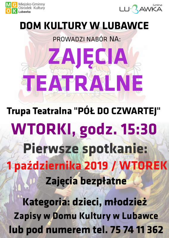 Nabór do trupy teatralnej "Pół do Czwartej" Trupa Teatralna "Pół do Czwartej" zaprasza na pierwsze spotkanie organizacyjne w dniu 1.10 br. o godz. 15:30 w Domu Kultury w Lubawce. Zajęcia prowadzone są przez panią Irenę Wyciślik. Galeria zdjęć Magdalena Klag MGOK Data wydarzenia: 2019-09-30 Stworzony: 2019-09-30 12:28 Edytowany: 2019-09-30 16:49