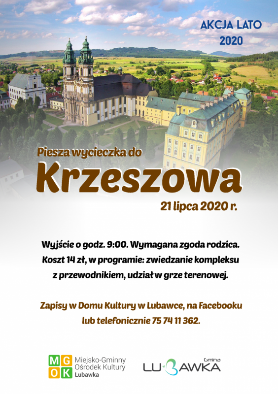 Każdy z Nas wie, że ruch to zdrowie, więc już dziś zapraszamy na kolejne spotkanie w ramach Akcji Lato, którą jest piesza wycieczka do Krzeszowa. W programie: zwiedzanie kompleksu z przewodnikiem, udział w grze terenowej.