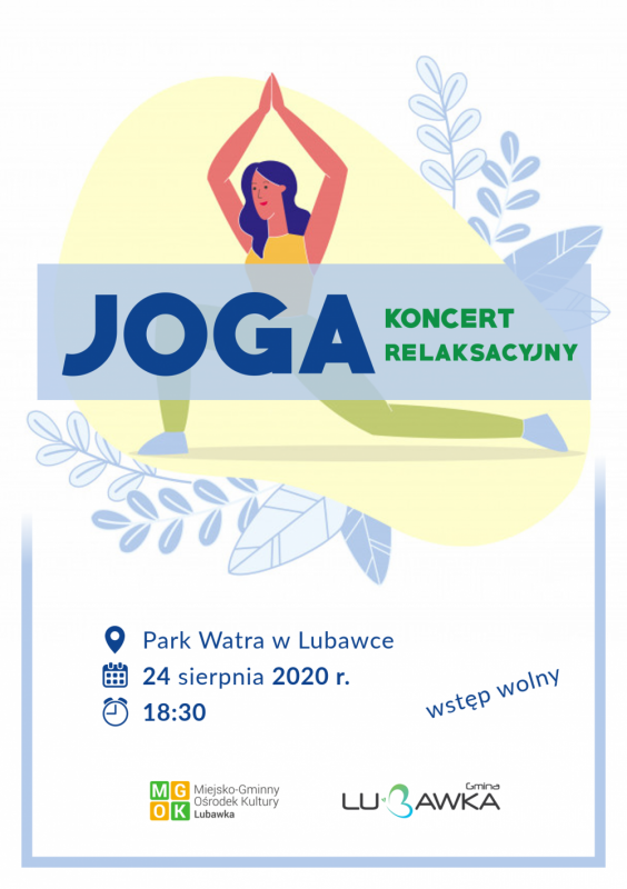 Zapraszamy wszystkich chętnych na Jogę oraz koncert mis i gongów. Zajęcia poprowadzi Pani Urszula Szmidt. Wszystkich chętnych zapraszamy, 24 sierpnia o godzinie 18:30 do Parku Watra w Lubawce. WSTĘP WOLNY!