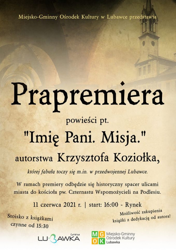 Prapremiera powieści pt. ,,Imię Pani. Misja" Nowe dzieło Krzysztofa Koziołka, którego akcja toczy się w Lubawce i okolicach ujrzy światło dzienne już w najbliższy piątek. Zapraszamy na uroczystą prapremierę - rozpoczynamy o 16:00 na Rynku! Galeria zdjęć Anita Makarewicz MGOK Data wydarzenia: 2021-06-09 Stworzony: 2021-06-09 08:42 Edytowany: 2021-06-09 09:18