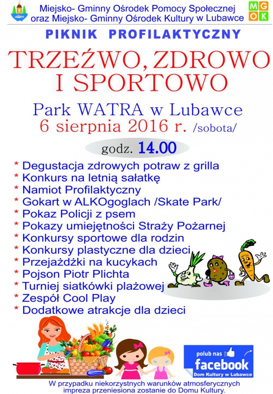 Dnia 06.08.2016 w Parku "Watra" w Lubawce odbędzie się piknik profilaktyczny pod hasłem "Trzeźwo, Zdrowo i Sportowo". Ideą Pikniku jest zachęcenie społeczności lokalnej do zdrowego stylu życia, aktywności ruchowej oraz popularyzowanie idei trzeźwościowych. Miesiąc sierpień jest dobrym czasem do przeprowadzenia tego rodzaju przedsięwzięć, ponieważ jest to miesiąc trzeźwości.