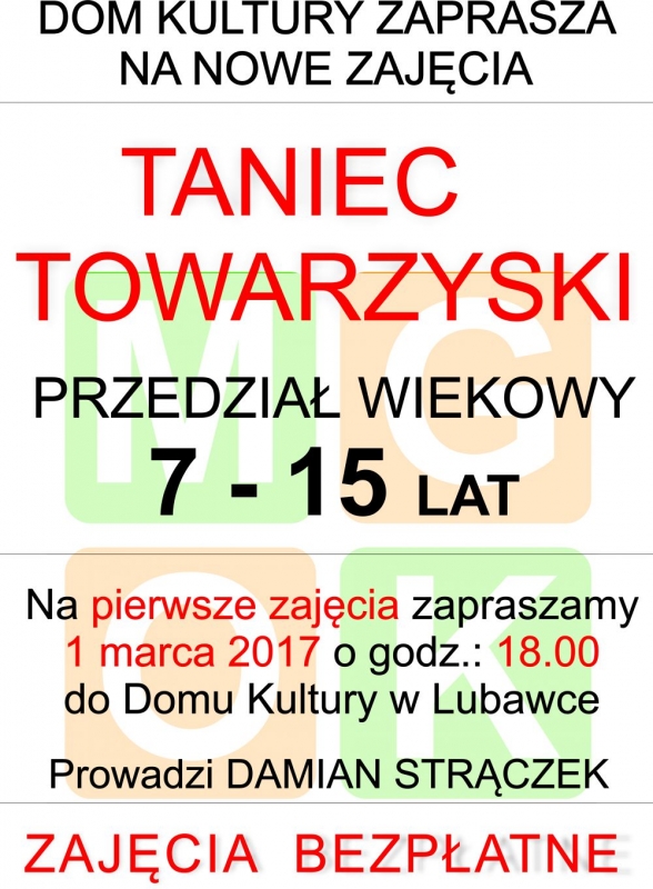 Dom Kultury zaprasza dzieci i młodzież w wieku 7-15 lat na zajęcia TAŃCA TOWARZYSKIEGO. Pierwsze zajęcia odbędą się 1 marca br., o godz. 18.00 - prowadzi Damian Strączek.