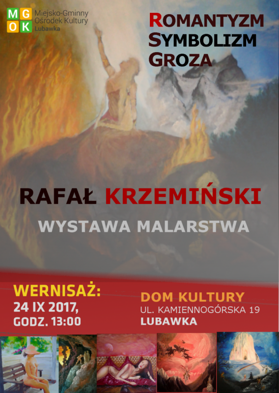 Serdecznie zapraszamy wszystkich mieszkańców i pasjonatów sztuki na otwarcie wystawy malarstwa Rafała Krzemińskiego pt. "Romantyzm, symbolizm, groza". Wernisaż odbedzie się już w najbliższą niedzielę (24 września 2017 r. ) o godzinie 13:00 w sali widowiskowej Domu Kultury w Lubawce przy ul. Kamiennogórskiej 19.
