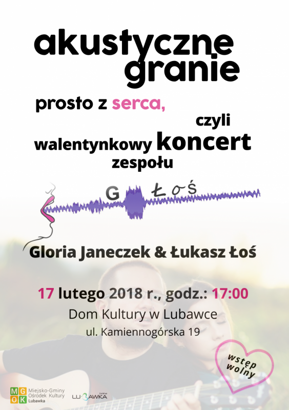 Dom Kultury w Lubawce serdecznie zaprasza 17 lutego (sobota) o godz. 17:00 na walentynkowe muzyczne uniesienia podczas kameralnego koncertu zespołu G/Łoś - Gloria Janeczek i Łukasz Łoś. W klimatycznej scenerii zabrzmią akustyczne aranżacje utworów znanych i lubianych oraz repertuar autorski artystów. Serdecznie zapraszamy!