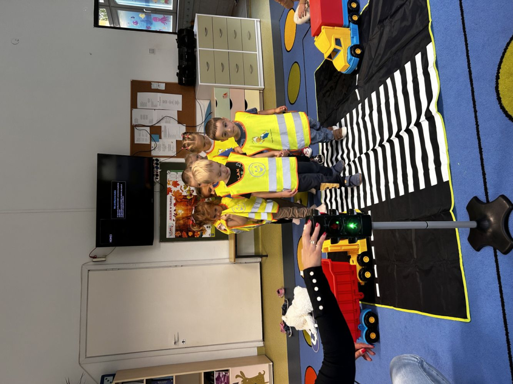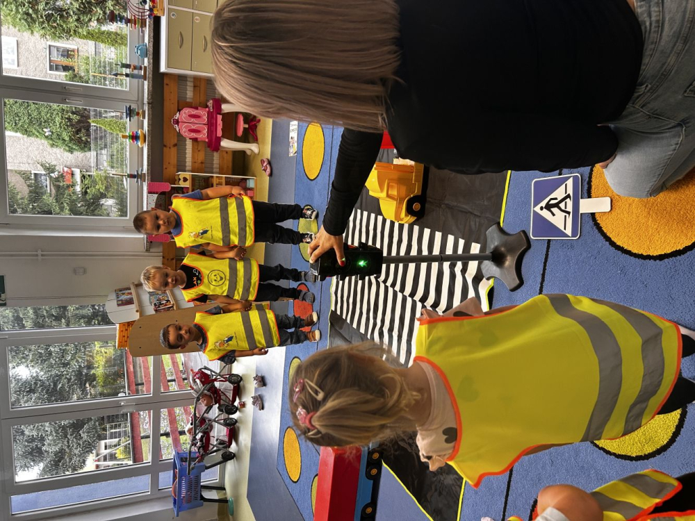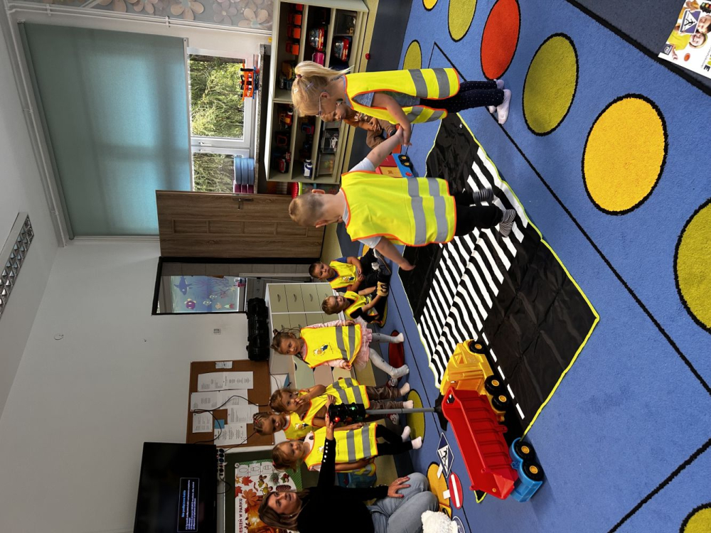 Podczas zajęć Skrzaty bawiły się w kierowców i pieszych, utrwalając w formie zabawy zdobytą wiedzę. Dzięki takim spotkaniom dzieci od najmłodszych lat kształtują prawidłowe nawyki, które pomagają im czuć się bezpiecznie na drodze.