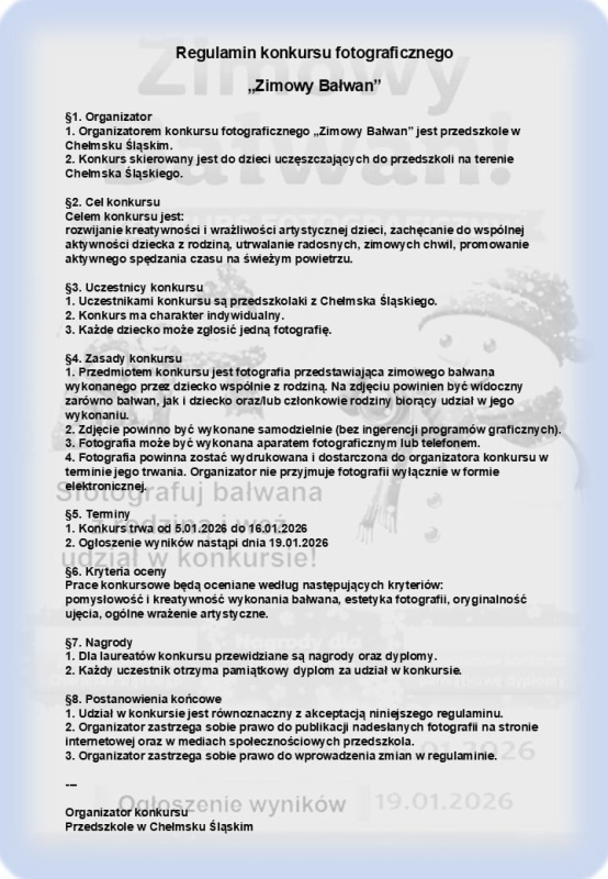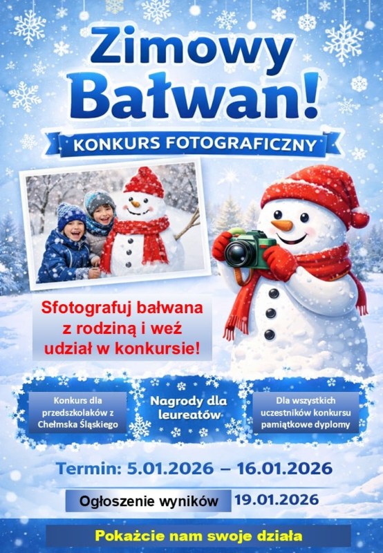 Konkurs fotograficzny "Zimowy Bałwan " Serdecznie zapraszamy do wzięcia udziału w konkursie fotograficznym "Zimowy Bałwan" Galeria zdjęć Paulina Mitręga ZSP Chełmsko Śląskie Data wydarzenia: 2026-01-06 Stworzony: 2026-01-06 12:39 Edytowany: 2026-01-06 12:44